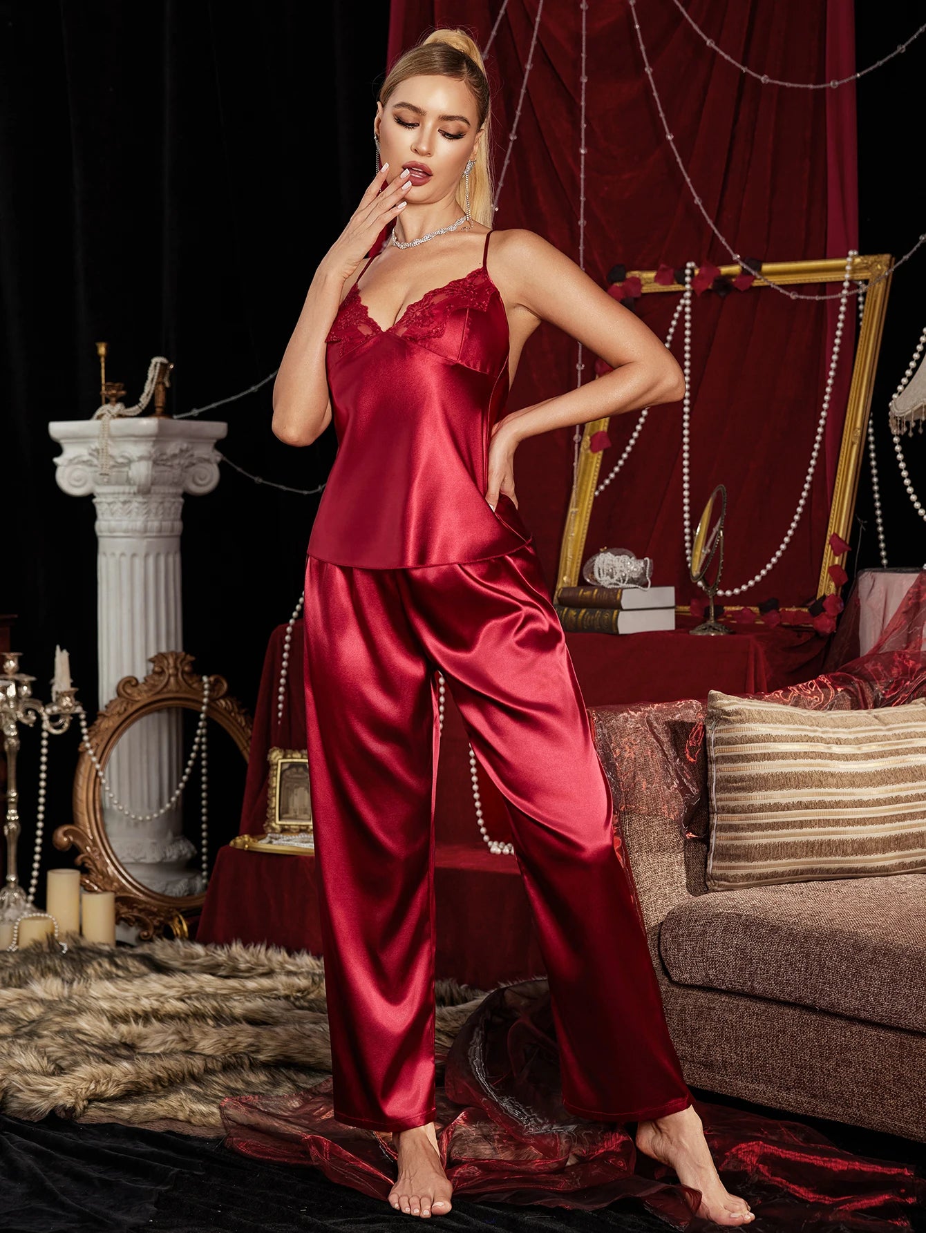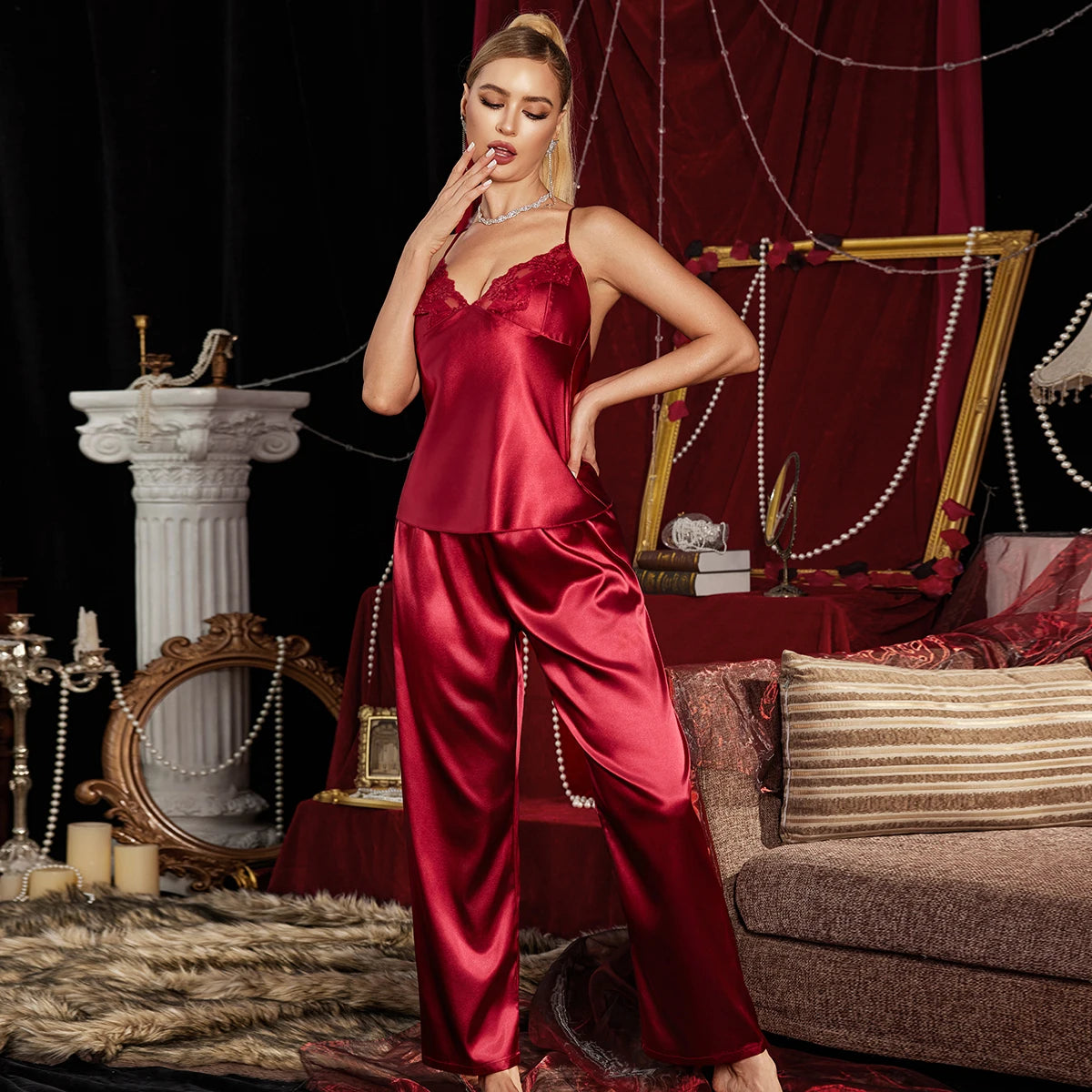 El top de tirantes finos con delicado encaje realza el escote con sutileza, mientras que el pantalón de líneas suaves aporta comodidad y sofisticación. Cada detalle está pensado para acariciar la piel y crear una experiencia de lujo íntimo.