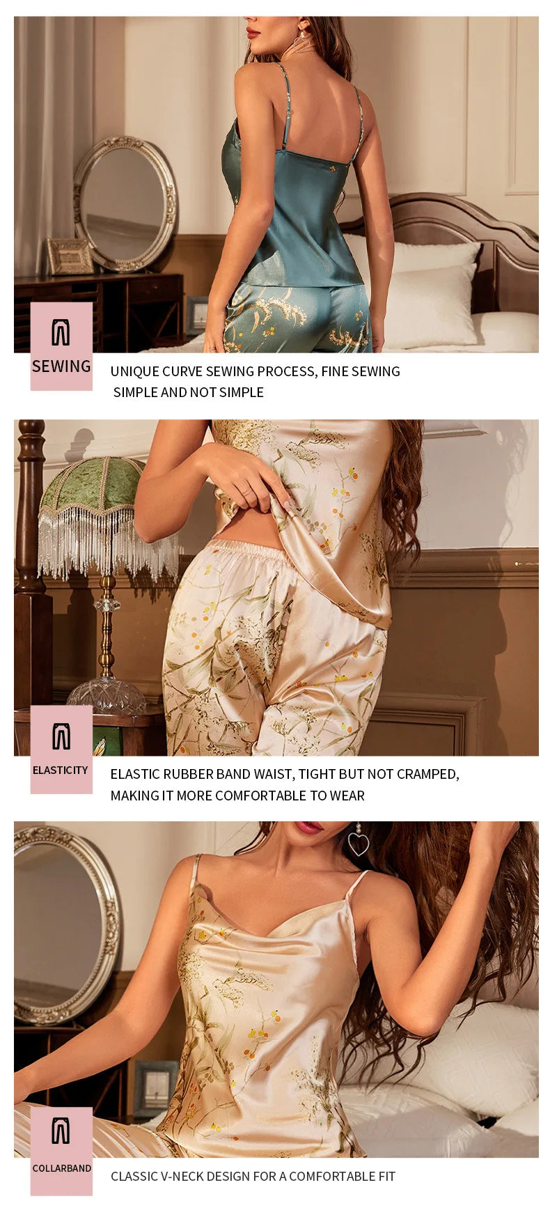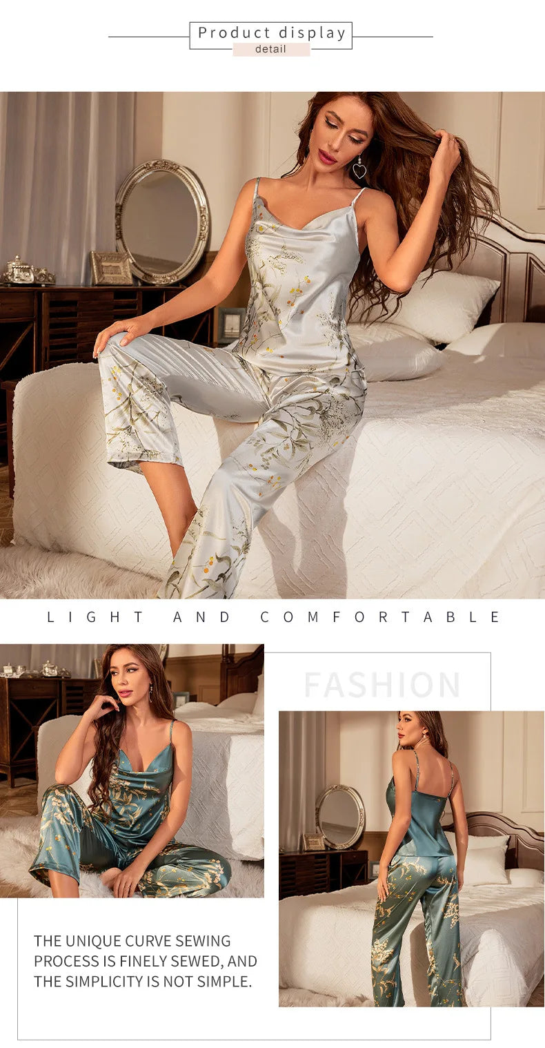 Su top de tirantes finos y pantalón de caída elegante realzan la silueta con naturalidad, aportando un equilibrio perfecto entre sensualidad y comodidad. La textura satinada refleja la luz suavemente, envolviendo el cuerpo con un lujo sutil y femenino.