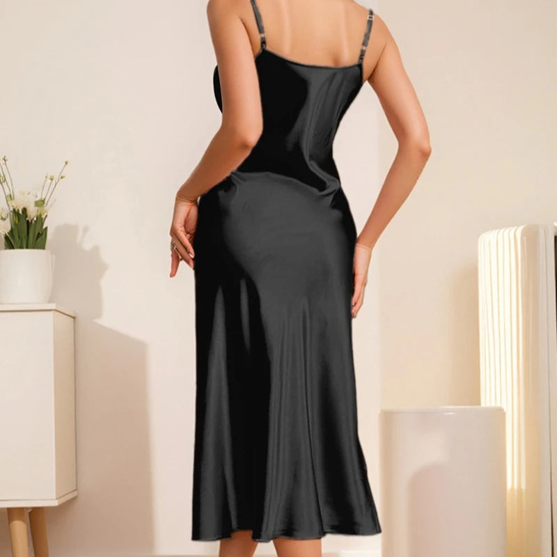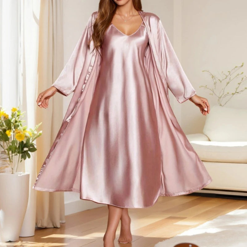 Compuesto por un camisón de líneas limpias y una bata amplia y envolvente, este diseño ofrece una silueta femenina y armoniosa que se adapta con naturalidad al movimiento. Su tacto sedoso acaricia la piel, convirtiendo cada momento de descanso en una experiencia de lujo sereno.