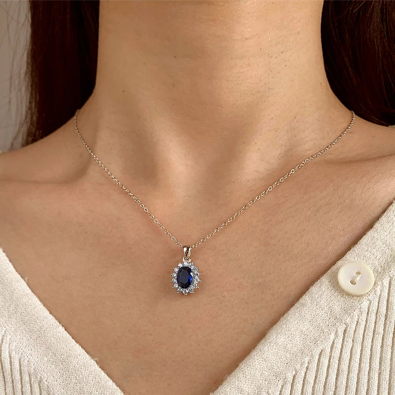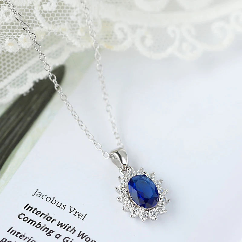 Collar de Plata 925 con Zafiro Azul Ovalado y Halo de Cristales